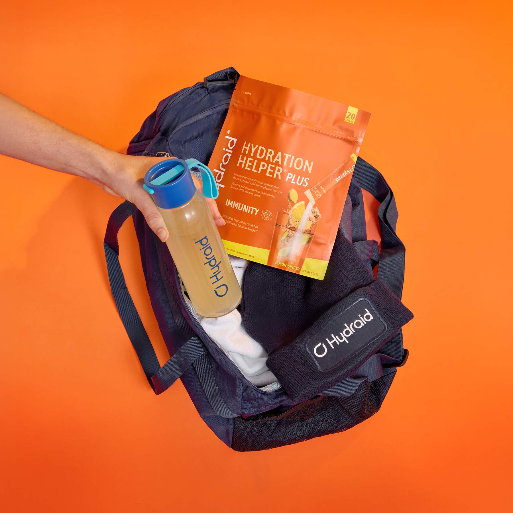 Der Hydration Helper® PLUS Immunity Lemon-Ginger enthält 20 Sticks in der erfrischenden Sorte Zitrone-Ingwer. Ergänze das Produkt mit der 0,5 L Hydraid® Flasche aus BPA-freiem Tritan (blauer oder schwarzer Deckel) oder mit der 0,65 L Hydraid® Sportflasche mit praktischem Einhandverschluss, perfekt für 1 Portion Hydraid® und du bist ready für jedes sportliche Abenteuer bei jedem Wetter.